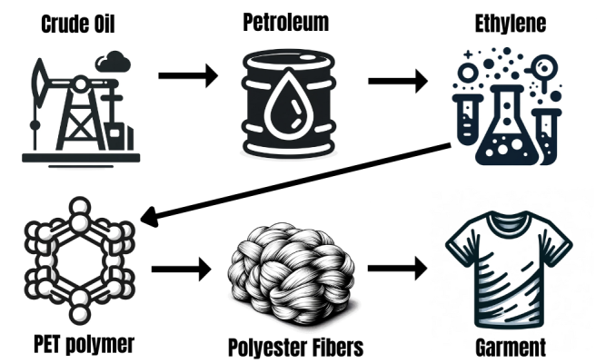 Ο πολυεστέρας παράγεται από ορυκτά καύσιμα (πετρέλαιο), και η παραγωγή του είναι ενεργοβόρα, συμβάλλοντας στην κλιματική αλλαγή. Όταν απορρίπτεται, δεν αποσυντίθεται, με αποτέλεσμα να παραμένει στο περιβάλλον για εκατοντάδες χρόνια.