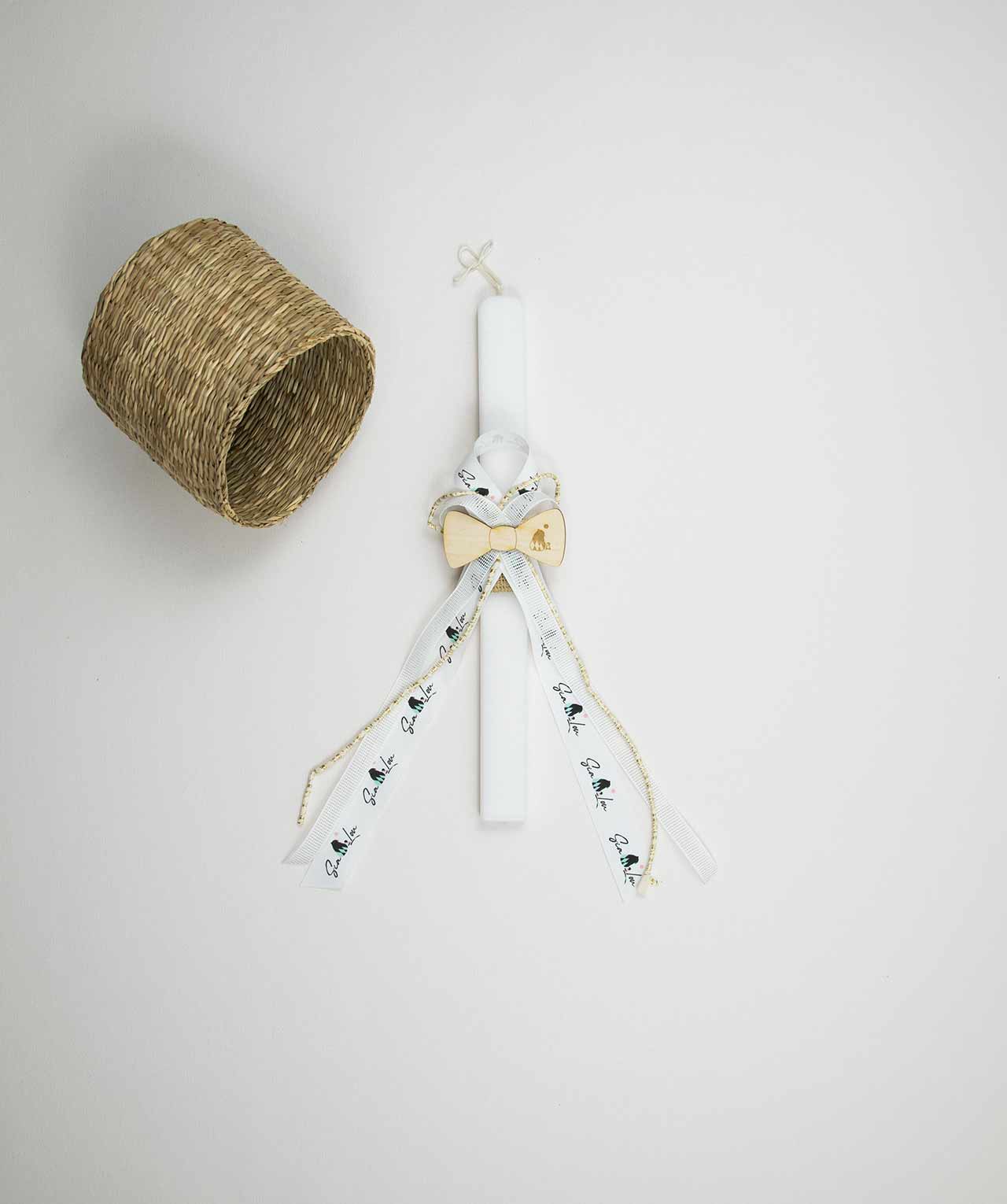 Χειροποίητη πασχαλινή λαμπάδα για τους μικρούς μας κυρίους ! Είναι διακοσμημένη με ξύλινο παπιγιόν και κορδέλες σε κίτρινες αποχρώσεις . Η διάσταση της λαμπάδας είναι 35 * 3 εκατοστά.