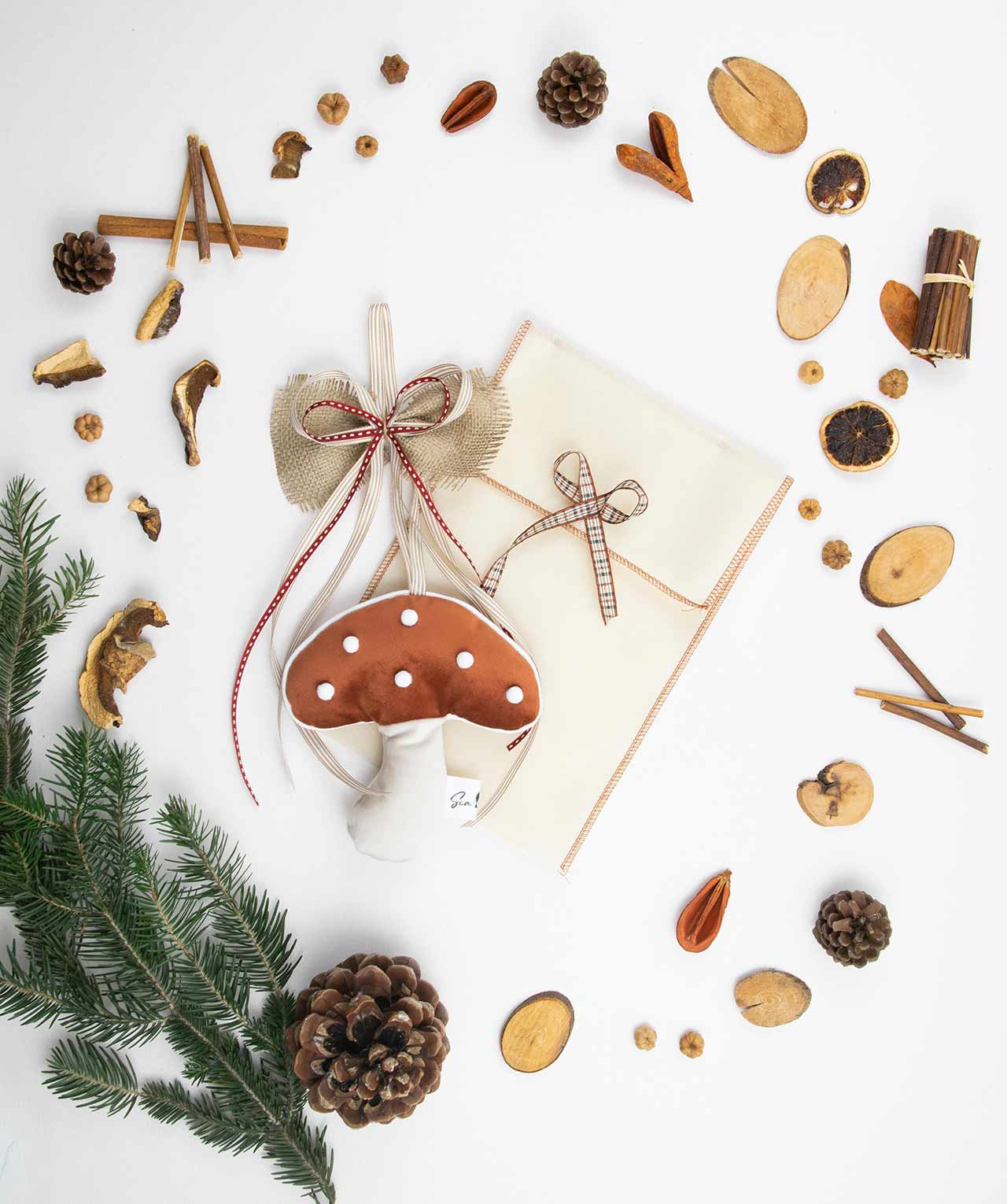 Αυτό το μικρό έργο τέχνης φέρει την αγάπη και τη φροντίδα που έχει δοθεί σε κάθε του λεπτομέρεια: πολύχρωμες κορδέλες που περιτριγυρίζουν το στολίδι με φινέτσα, και ένα γλυκό μανιτάρι φτιαγμένο από απαλό ύφασμα, που προσθέτει μια ζεστή, φυσική αίσθηση στον χώρο σας.Επίσης μπορείται να αφαιρέσετε πολύ εύκολα το πάνω μέρος του φιόγκου και να χρησιμοποιήσεται το μανιτάρι και το φιόγκο ξεχωριστά για στολίδια δέντρου 2 σε 1.
