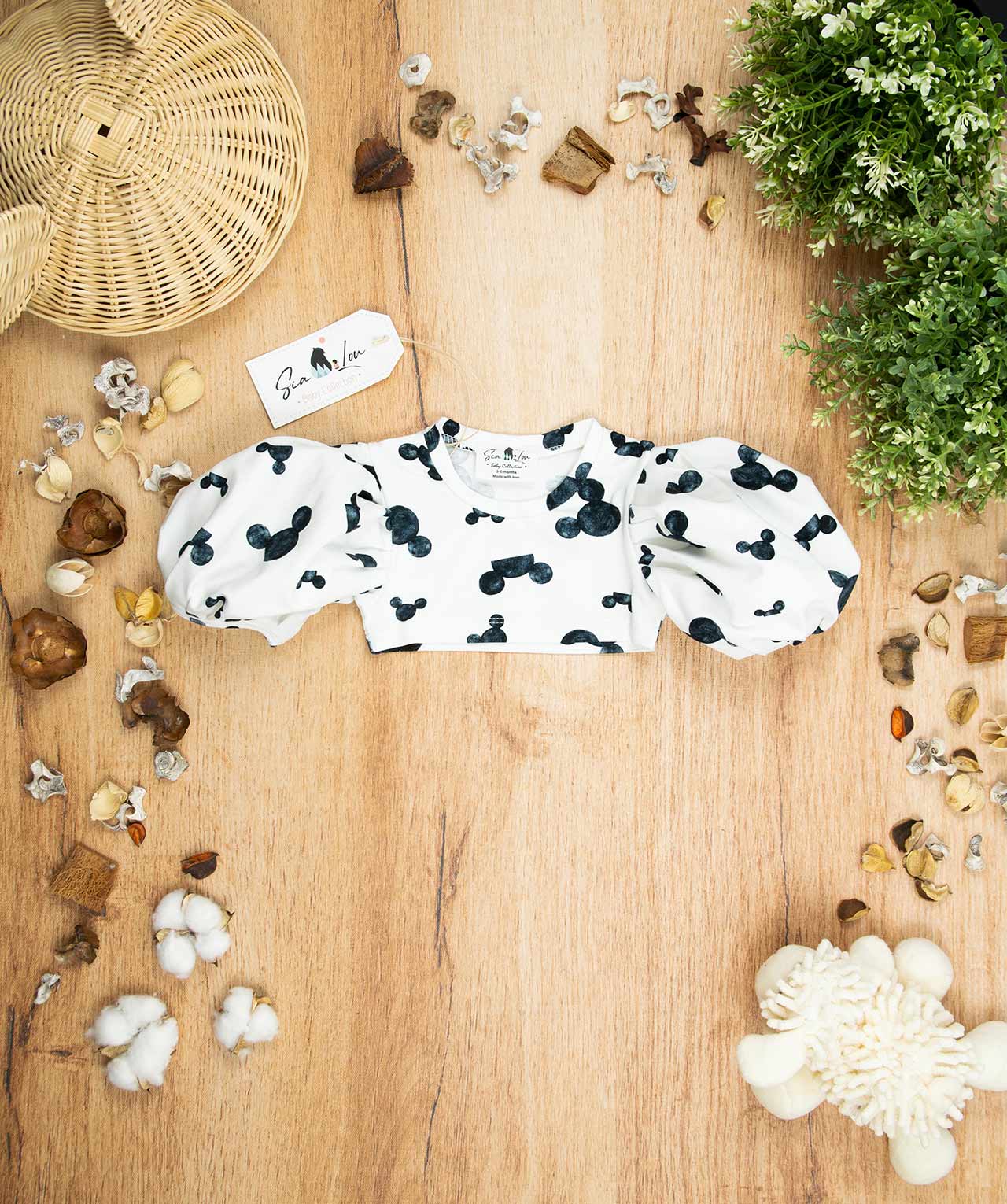 Μπλούζα crop top για κορίτσι σε Mickey. Το μπλουζάκι έχει χαμόγελο λαιμόκοψη είναι εφαρμοστό στο στήθος και φουσκωτά μανίκια 3/4 τα οποία στο τελείωμα είναι σούρα. Ο συνδυασμός αυτός δίνει ένα μοναδικό στιλ στα κορίτσια και πολύ μοντέρνο. Το μπλουζάκι αυτό είναι πολύ άνετο με μαλακό ύφασμα που είναι ιδανικό για το δέρμα του παιδιού. Όλα τα ρούχα μας κατασκευάζονται από, φιλικά προς το παιδί και το περιβάλλον, υφάσματα υψηλής ποιότητας, με τις τελευταίες πιστοποιήσεις σε OECO TEX και GOTS.
