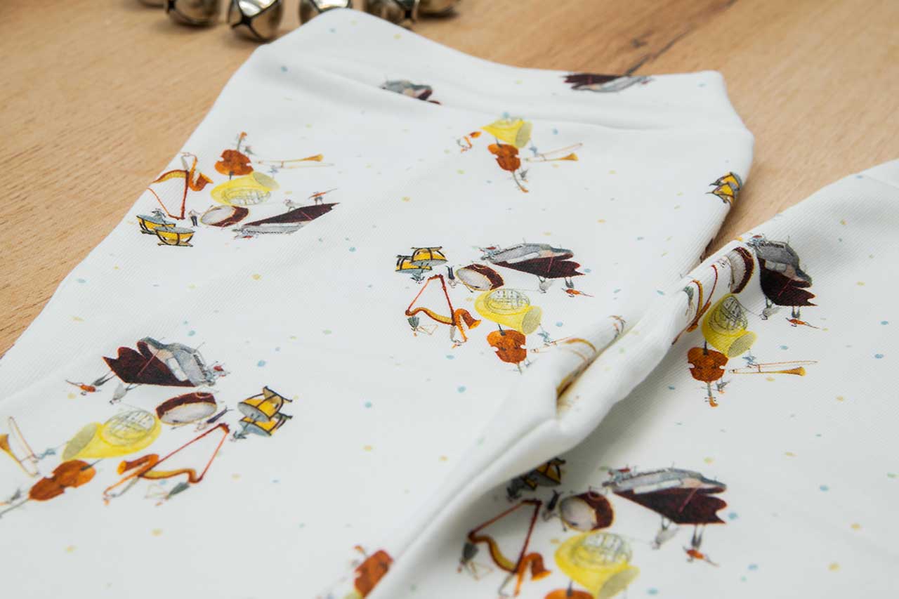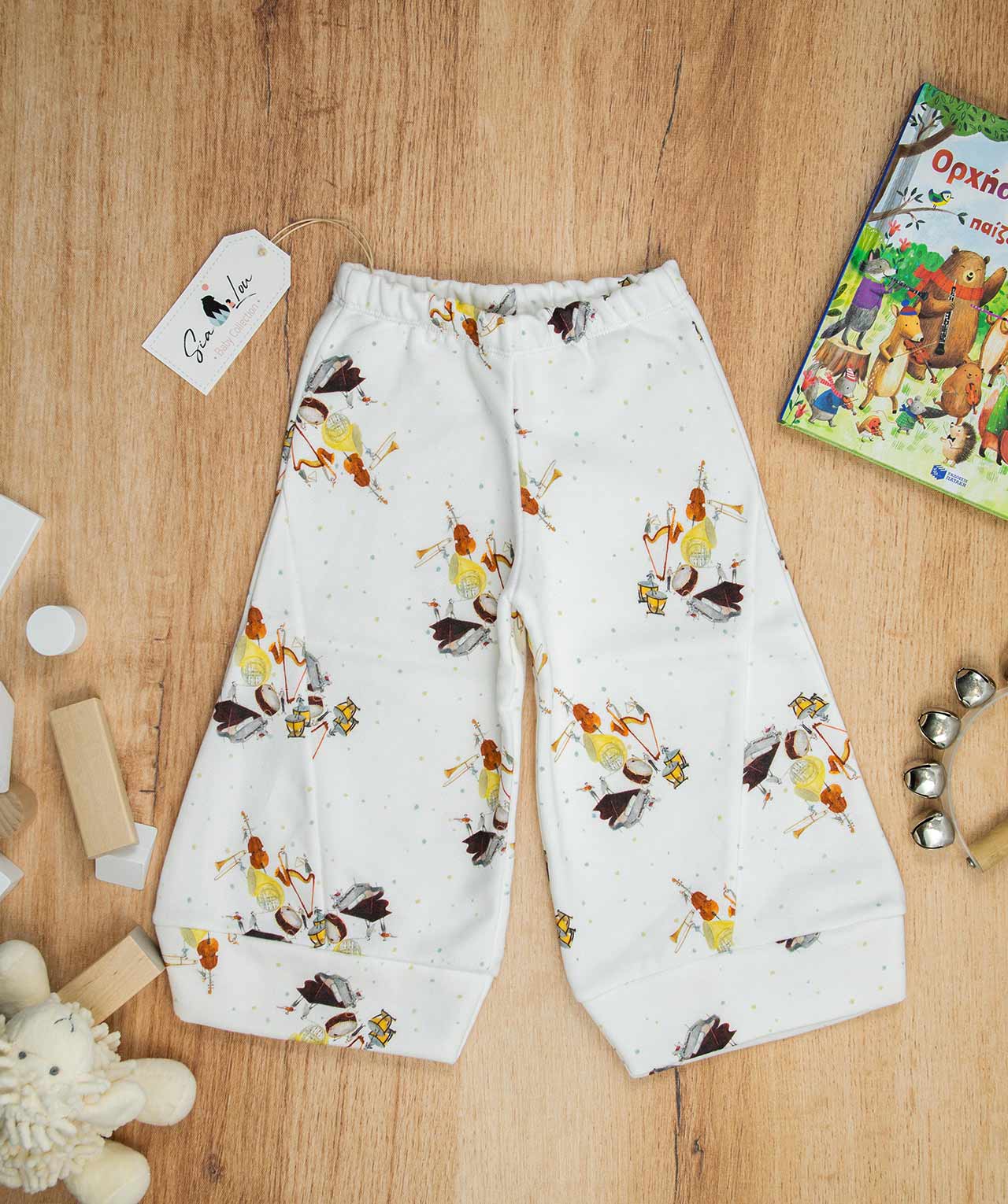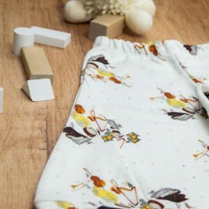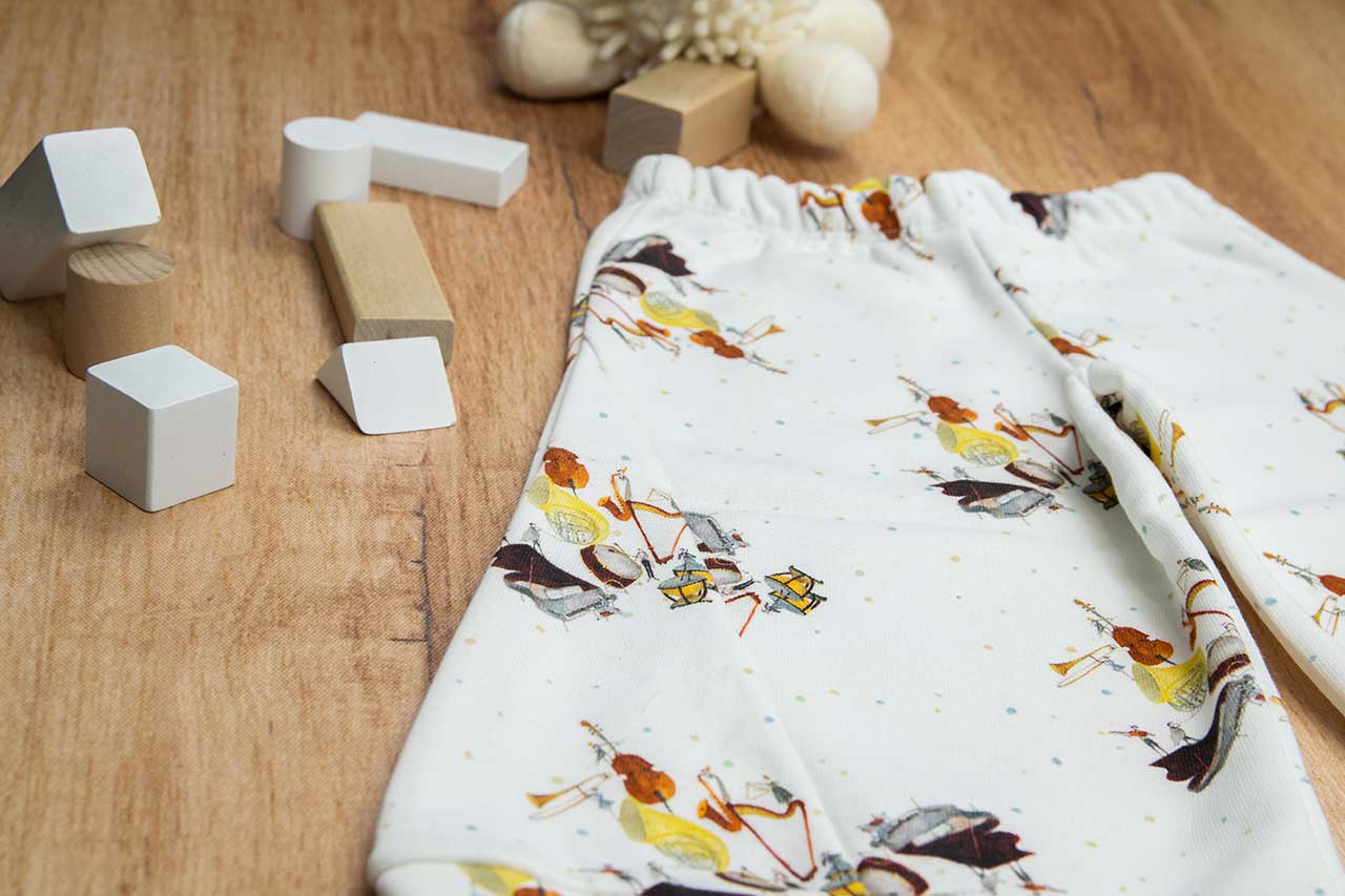 Παντελόνα με μπάσκα σε σχέδιο Orchestra, κατάλληλο τόσο για βόλτα όσο και για μέσα στο σπίτι. Ο σχεδιασμός της παντελόνας είναι σε άνετη γραμμή με τρίγωνα κομμάτια στο πλάι και μπάσκα στο τελείωμα. Είναι πολύ άνετη με μαλακό και ζεστό ύφασμα που είναι ιδανικό για το δέρμα του παιδιού. Επειδή τα ρούχα μας είναι χειροποίητα και κατόπιν παραγγελίας, η τοποθέτηση του μοτίβου μπορεί να διαφέρει ελαφρώς από αυτό που απεικονίζεται. Δεν υπάρχουν δύο παντελόνες που να είναι ακριβώς ίδιες, καθιστώντας τη καθεμία μοναδική. Η φωτογραφία μπορεί να παρεκκλίνει ελάχιστα στα χρώματα του τυπώματος. Όλα τα ρούχα μας κατασκευάζονται από, φιλικά προς το παιδί και το περιβάλλον, υφάσματα υψηλής ποιότητας, με τις τελευταίες πιστοποιήσεις σε OECO TEX και GOTS.
