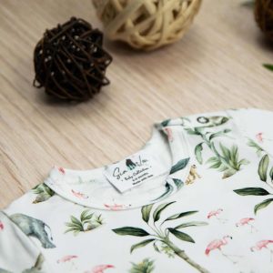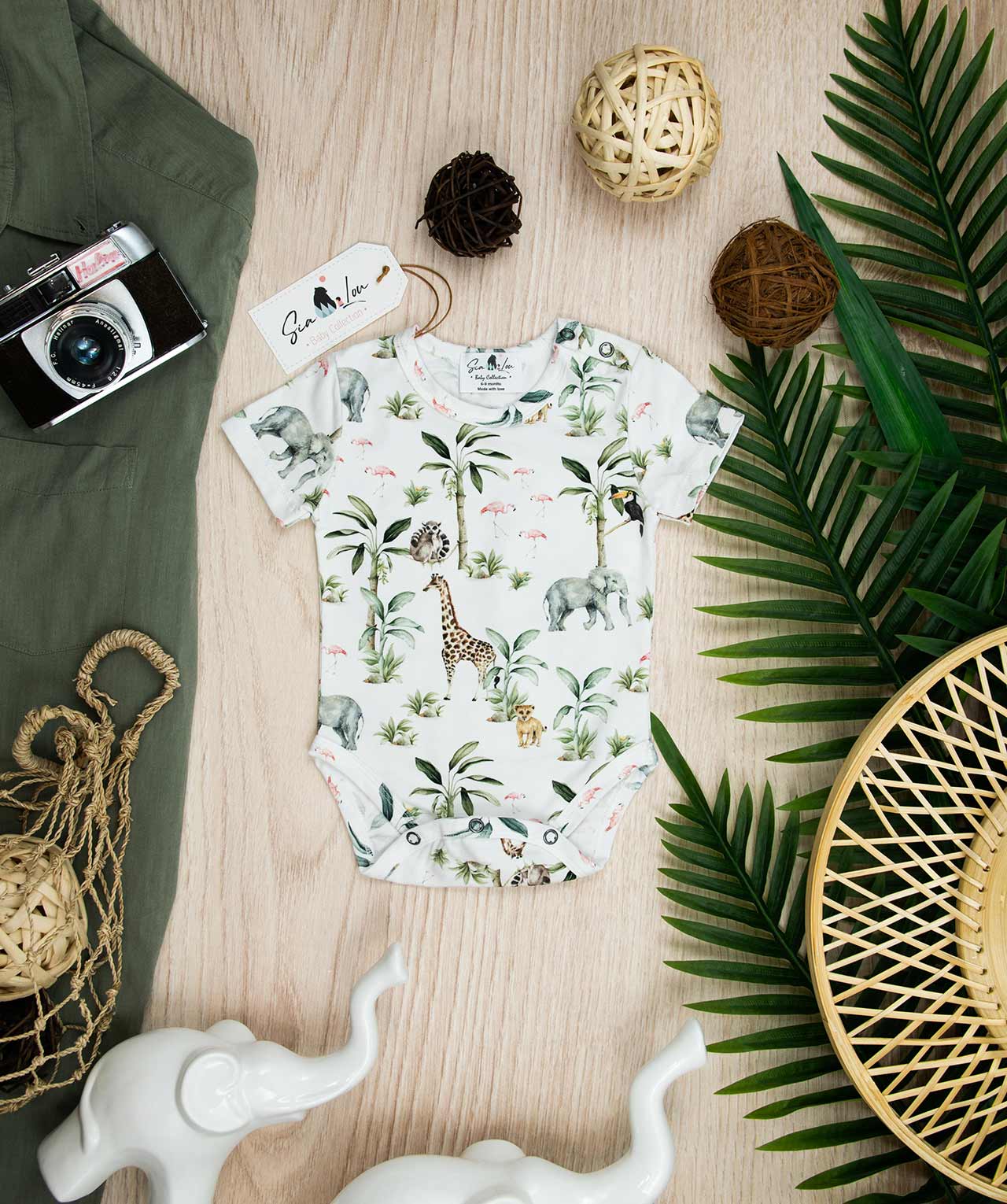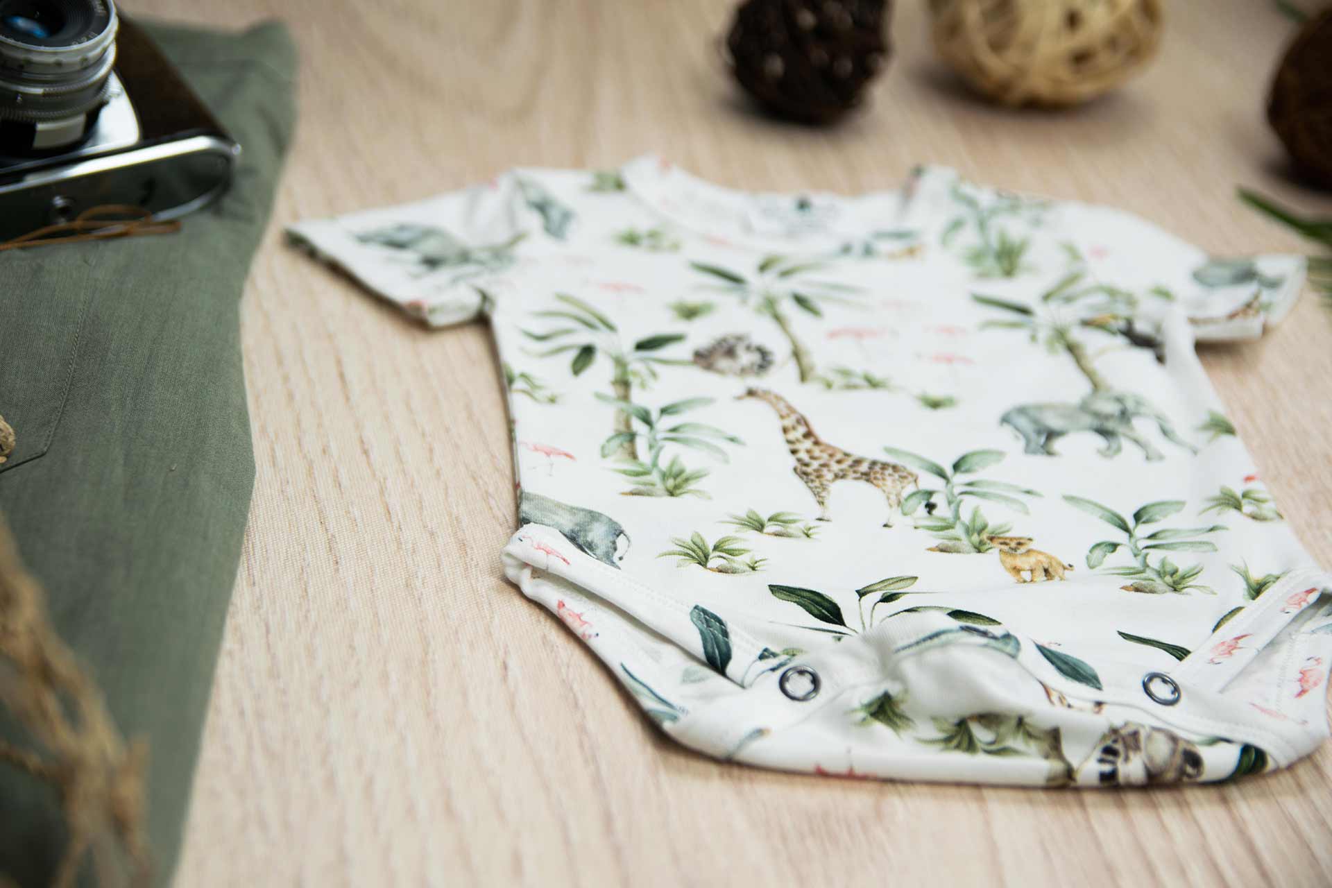 Κορμάκι κοντομάνικο με σχέδιο Safari, κατάλληλο τόσο για βόλτα όσο και για μέσα στο σπίτι. Έχει επανότισμα στον ώμο ώστε να μπορεί η μαμά να το φορέσει εύκολα στο παιδί .Επίσης έχει τρουξ στο καβάλο για εύκολο άνοιγμα. Επειδή είναι χειροποίητα και κατόπιν παραγγελίας, η τοποθέτηση του μοτίβου μπορεί να διαφέρει ελαφρώς από αυτό που απεικονίζεται. Δεν υπάρχουν δύο κορμάκια που να είναι ακριβώς ίδια, καθιστώντας το καθένα μοναδικό. Η φωτογραφία μπορεί να παρεκκλίνει ελάχιστα στα χρώματα του τυπώματος. Το κορμάκι αυτό είναι πολύ άνετο με μαλακό ύφασμα που είναι ιδανικό για το δέρμα του παιδιού. Όλα τα ρούχα μας κατασκευάζονται από, φιλικά προς το παιδί και το περιβάλλον, υφάσματα υψηλής ποιότητας, με τις τελευταίες πιστοποιήσεις σε OECO TEX και GOTS.