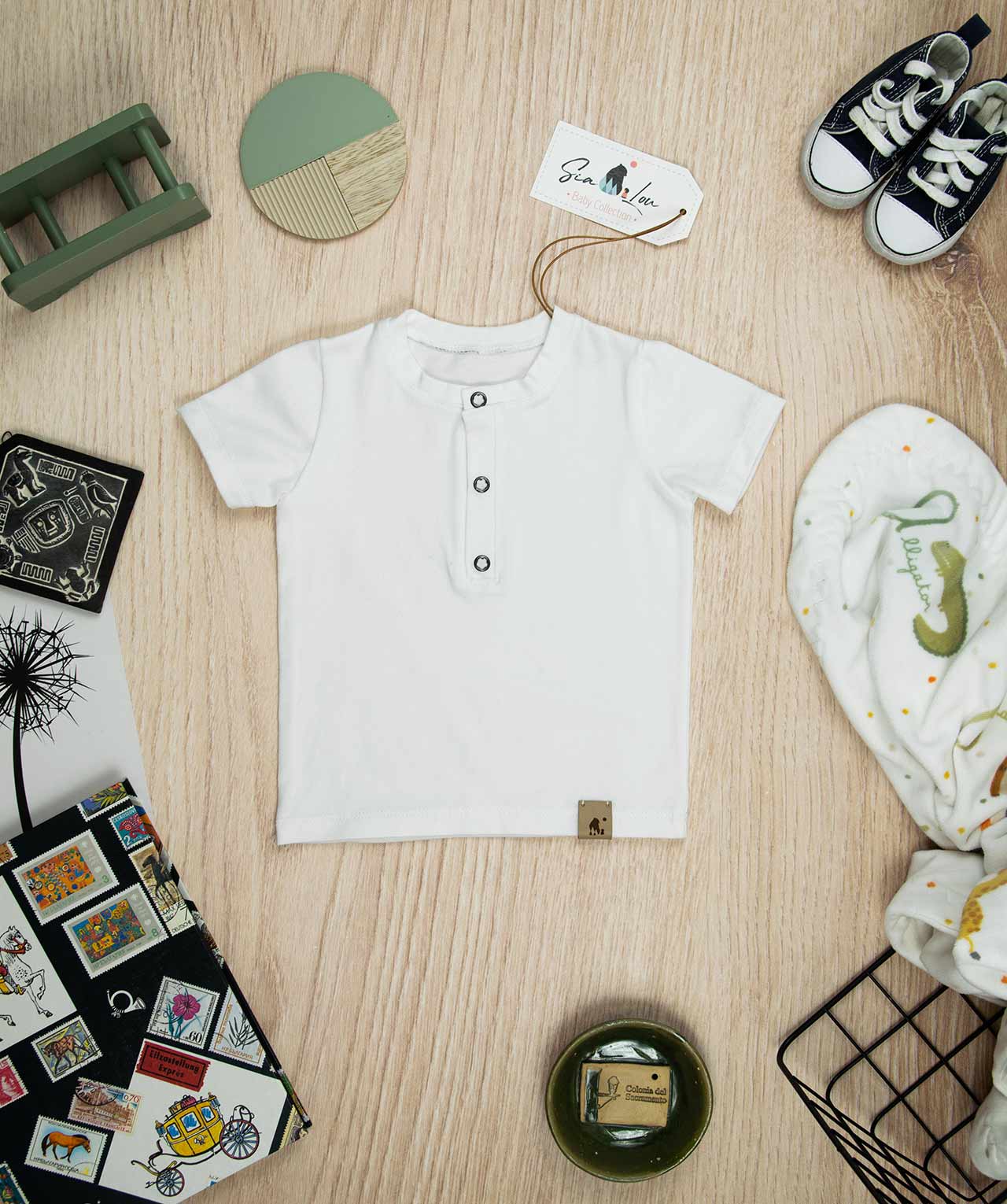 Μπλούζα για αγόρι σε λευκό χρώμα. Το μπλουζάκι έχει πατιλέτα με τρουκς και είναι κλασική γραμμή. Είναι πολύ άνετο με μαλακό ύφασμα που είναι ιδανικό για το δέρμα του παιδιού. Όλα τα ρούχα μας κατασκευάζονται από, φιλικά προς το παιδί και το περιβάλλον, υφάσματα υψηλής ποιότητας, με τις τελευταίες πιστοποιήσεις σε OECO TEX και GOTS.
